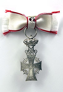 - Caballero de primera clase (Ridder af 1. grad) - Usa la divisa en una cinta (caballeros) o en un lazo (damas), ambos con roseta, en la parte izquierda del pecho;